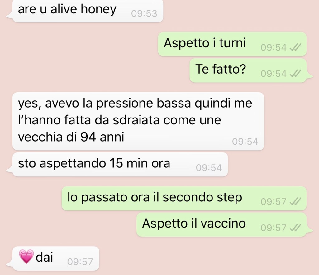 Step 2: Consegno parte di quei moduli ad una sorta di accettazione, e poi vado a sedermi in mezzo a una generazione di palesi insegnanti del liceo; un’infermiera urla in loop dall’altra parte della sala “Avanti! Avanti!” e mi ci vorranno almeno 10 minuti per capire che forse avrei dovuto chiedere chi fosse l’ultimo prima di me, visto che mi stanno fissando tutti perché non mi sto alzando.