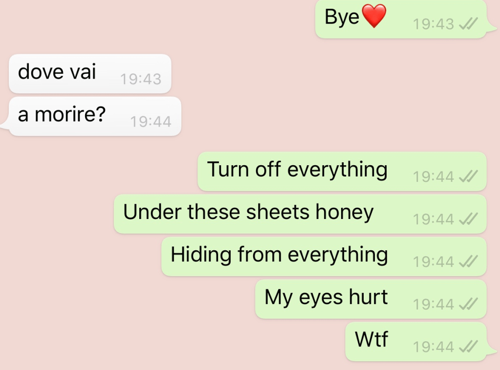 “Ma chissà se tutti quelli che erano con me stamattina a quest’ora stanno morendo nel letto come me.” Di loro non lo sapremo mai, ma io e @AlmostFiorentina ci siamo lamentate ad ogni ora, anche nel sonno, tramite la telepatia.